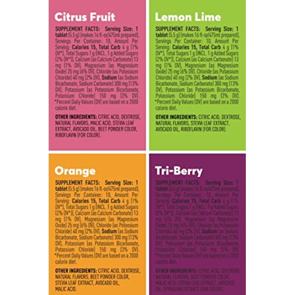 - Box contains one tube of each flavor: Lemon Lime, Tri-Berry, Citrus Fruit, and Orange. Four tubes and 40 servings total.