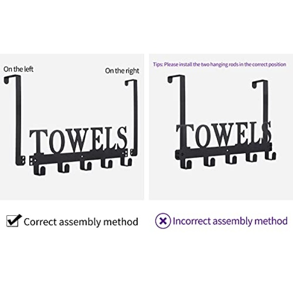 1.Assemble the towel racks and hang them on the door, making sure there is enough space above the door to fit a coin (about 1.5 mm). In addition, doors should be between 1.4-1.7 inches (3.5-4.5 cm) thick. Please check the product size before purchasing.