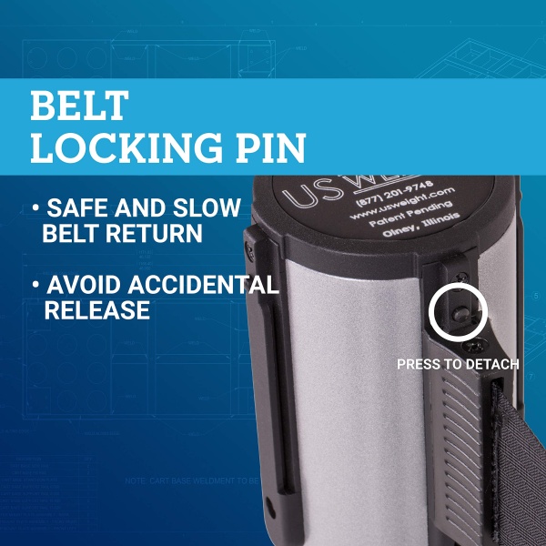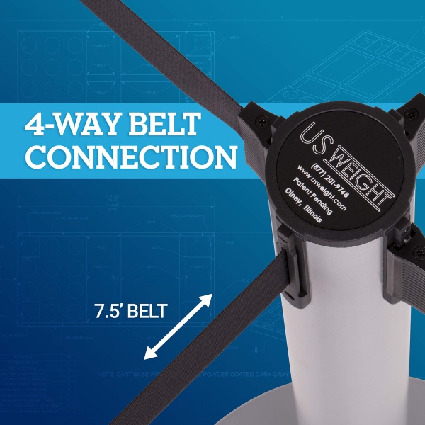 Details: Safety comes first for US Weight, and this priority is executed flawlessly with the Premium Steel Stanchion with an extended 7.5-Foot Pro Retractable Belt. This classic steel stanchion is perfect for safely controlling crowds, directing the flow of foot traffic, or protecting a closed area for construction or cleaning. Made in the United States, the 38.5-inch tall steel post features a Sherwin Williams Pro coat finish. Unlike other stanchions that begin to wobble over time and require endless repair, the US Weight Premium Stanchion will never lean or require maintenance due to our patented Sta-Straight Technology. Designed with four points of contact under continuous tension plus a high-strength compression collar, this spring-tension system keeps the post upright even after extended use. This stanchion also features innovative QuikSecure 5-second setup and tear down that requires no tools for easy twist-and-lock assembly. This stanchion features a pro belt cassette with a dual-braking system for slow and safe belt return. The post also features 3 belt receptacles to facilitate a 4-way connection to other posts. These receptacles feature a spring safety locking button to keep the belt securely fastened to the post and prevent accidental belt retraction. The belt end is compatible with most major stanchion brands allowing you to connect to the posts you already have. The base of the Premium Stanchion is made with durable, scratch-resistant high density polyethylene and filled with Duracast, a very high strength concrete. On the bottom of the base are no-skid, non-marking rubber feet keeping the post in place. Easily customize these stanchions to fit your need with two different post and base colors and nine belt options to choose from. A wheeled stanchion cart holding up to 12 units is available, making for easy storage and deployment. Stanchion cart model #U2509. To advertise signage, the Premium Stanchion is only compatible with #2507 Sign Holder (sold separately). US Weight, located in Olney, Illinois, delivers unmatched quality, safety, and innovation with the Premium Stanchion.